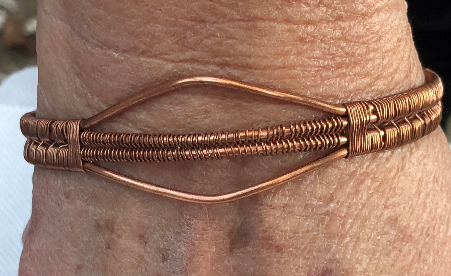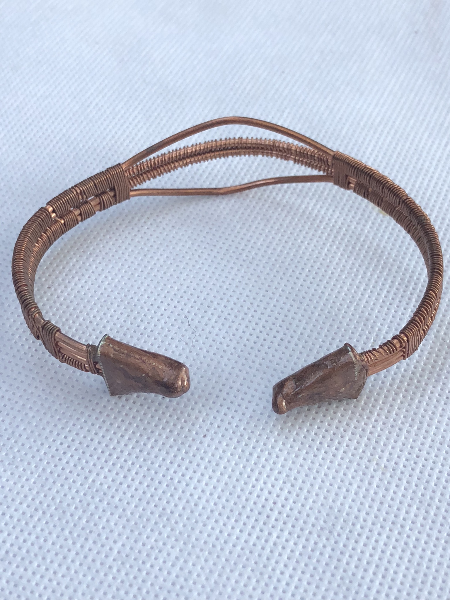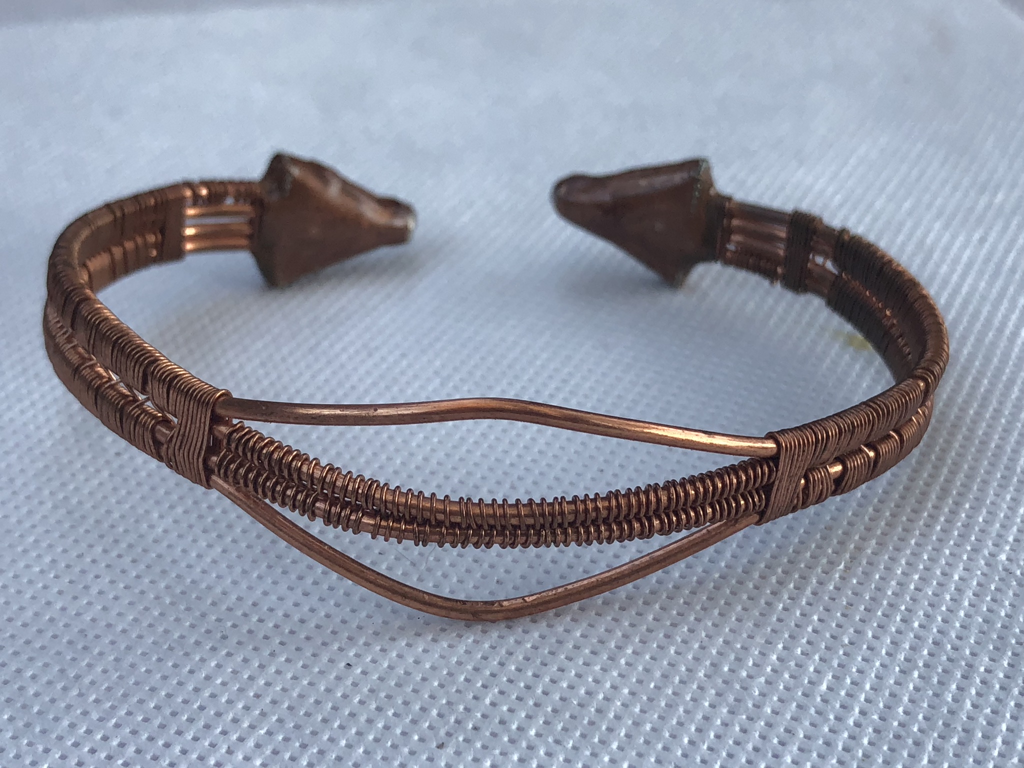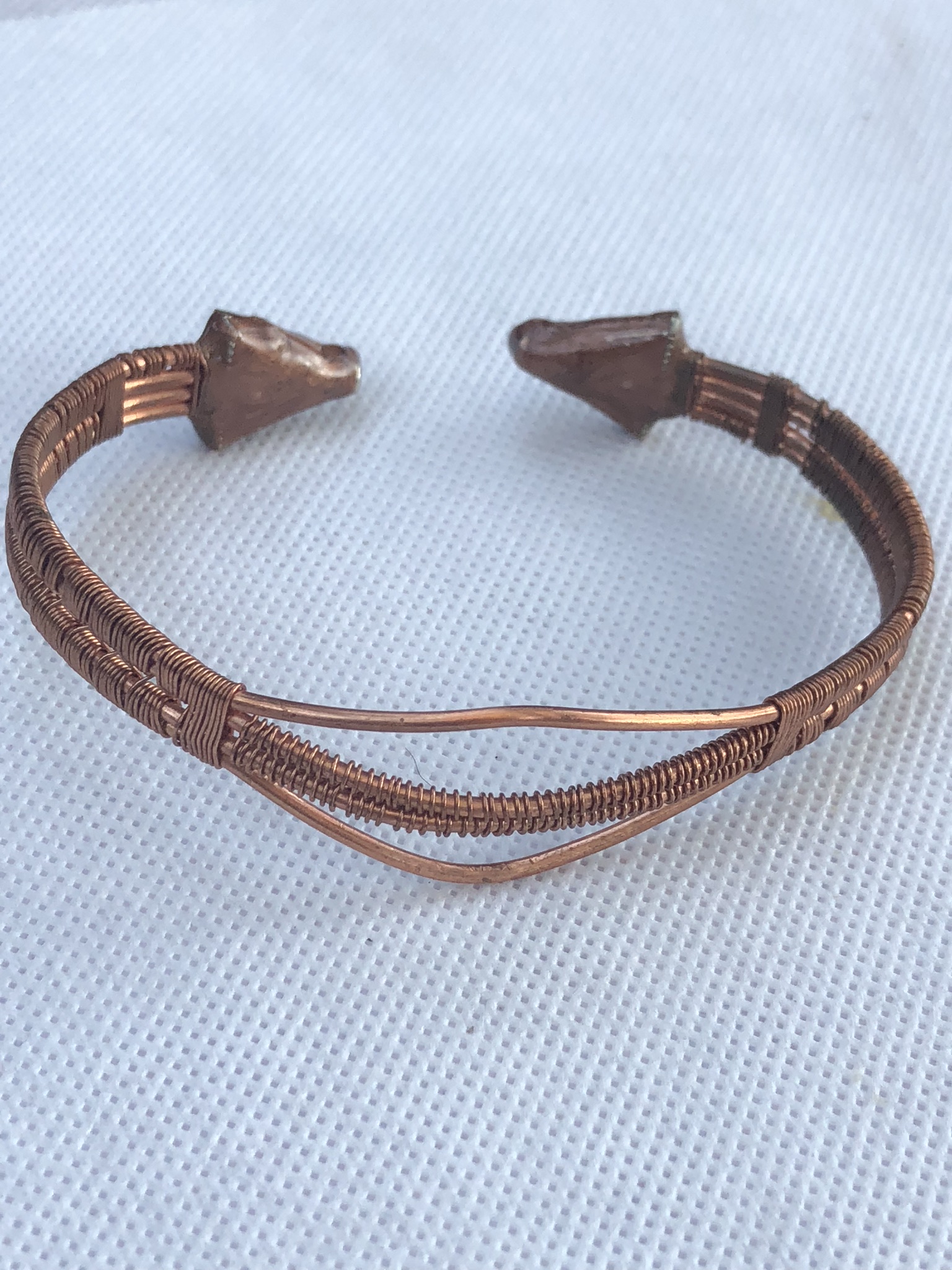 Wire wrapped in 100% copper.. This adjustable bracelet measures 7.5″ long. It is made to be worn open in the back to fit wrist from 6″-9″ wrist. Ends can be overlapped for a smaller wrist or left with a larger opening for a larger wrist.