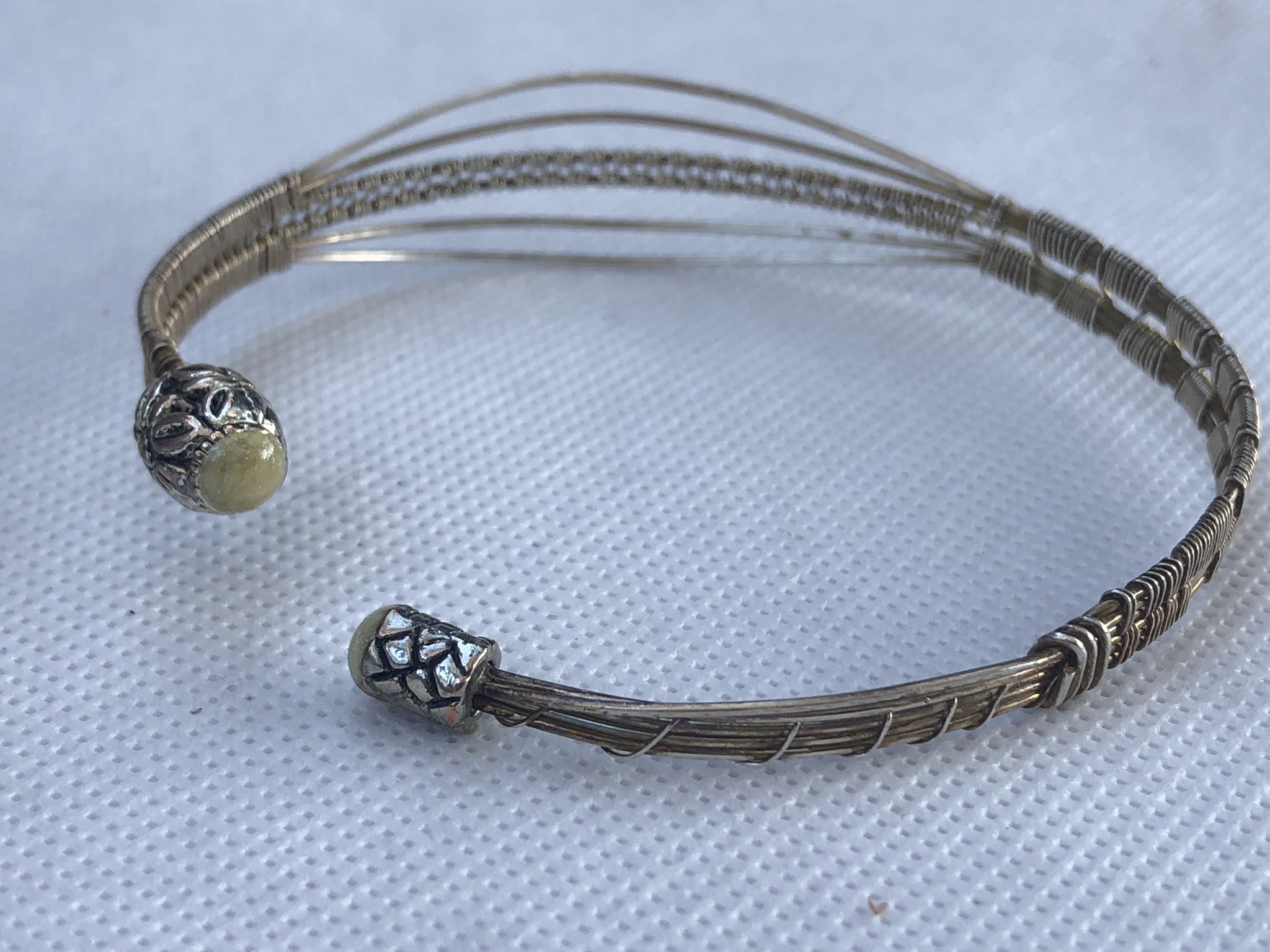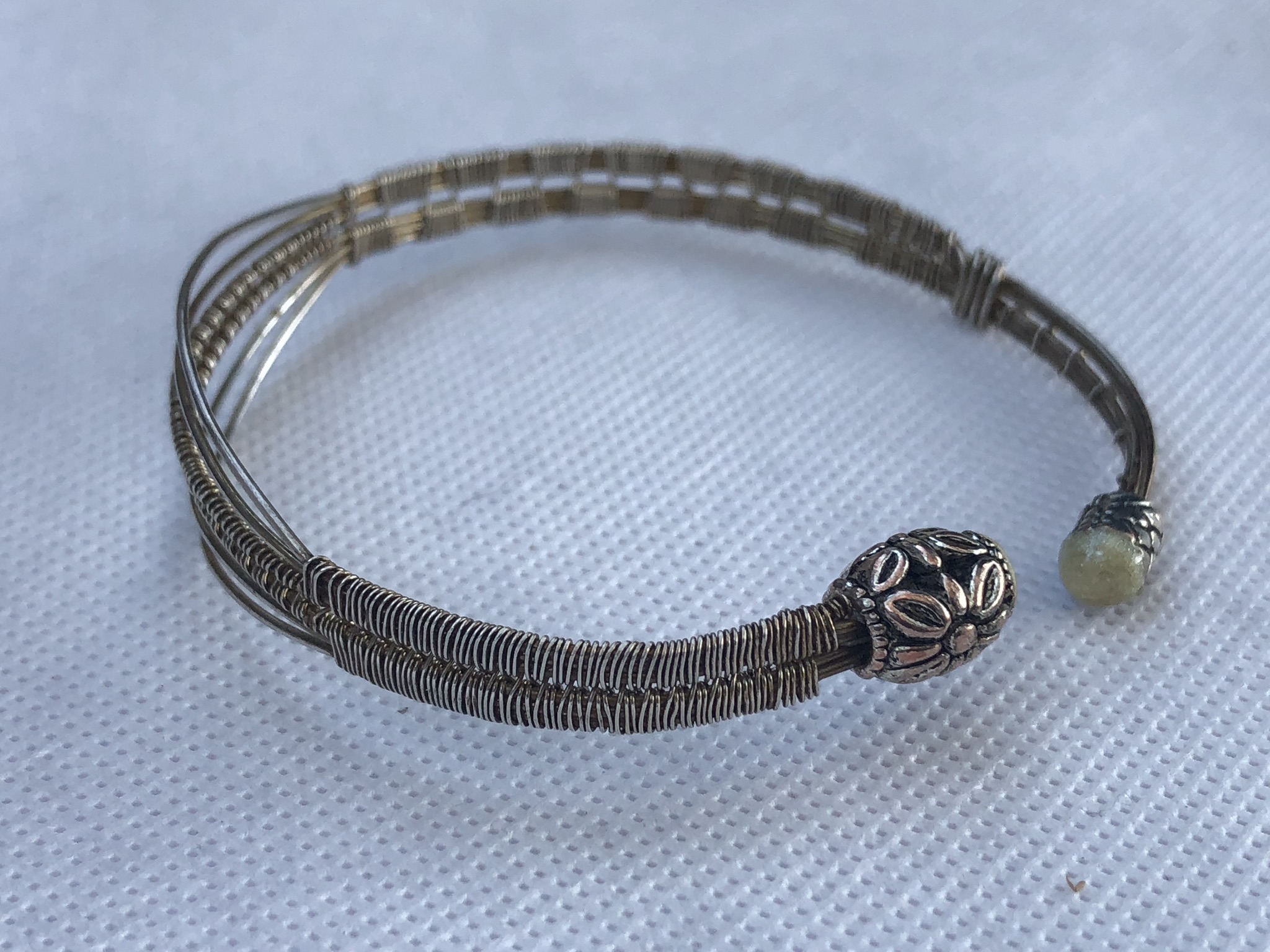 Wire wrapped in sterling silver. This adjustable bracelet measures 7.5″ long. It is made to be worn open in the back to fit wrist from 6″-9″ wrist. Ends can be overlapped for a smaller wrist or left with a larger opening for a larger wrist.